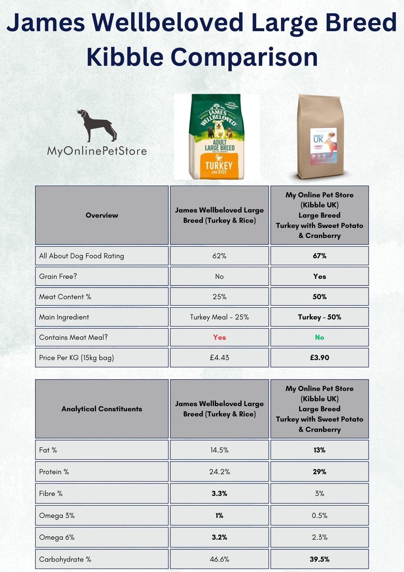 When comparing "James Wellbeloved Large Breed (Turkey & Rice)" and "My Online Pet Store (Kibble UK) Large Breed Turkey with Sweet Potato & Cranberry" for a large breed dog, the "My Online Pet Store" option continues to appear as the better choice.