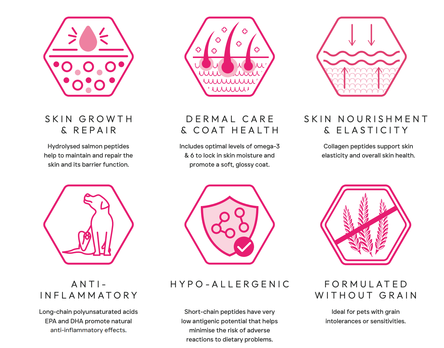 Discover the transformative power of Peptide+ Hydrolysed Dog Food for Skin & Coat Care – Salmon. This premium formula harnesses the benefits of hydrolysed salmon to deliver exceptional nutrition for dogs prone to sensitivities or allergies. Packed with easily digestible proteins and omega-rich oils, it works from within to restore skin health and reveal a lustrous, vibrant coat. Your dog deserves a complete, balanced meal that doesn't compromise on taste or nutrition. Experience the difference premium care makes.